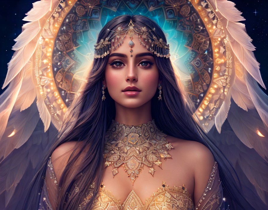 An illustrated angelic figure with ornate jewelry, celestial wings, and a halo of stars, exuding a mystical and serene aura.
