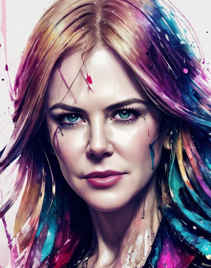 Nicole Kidman [Speedpaint by carne griffiths, robert oxley, Ismail Inceoglu, wadim kashin, richard anderson; {paint drips; drip painting; a masterpiece; 8k resolution; trending on artstation; maximalist; uncanny; Holi}]