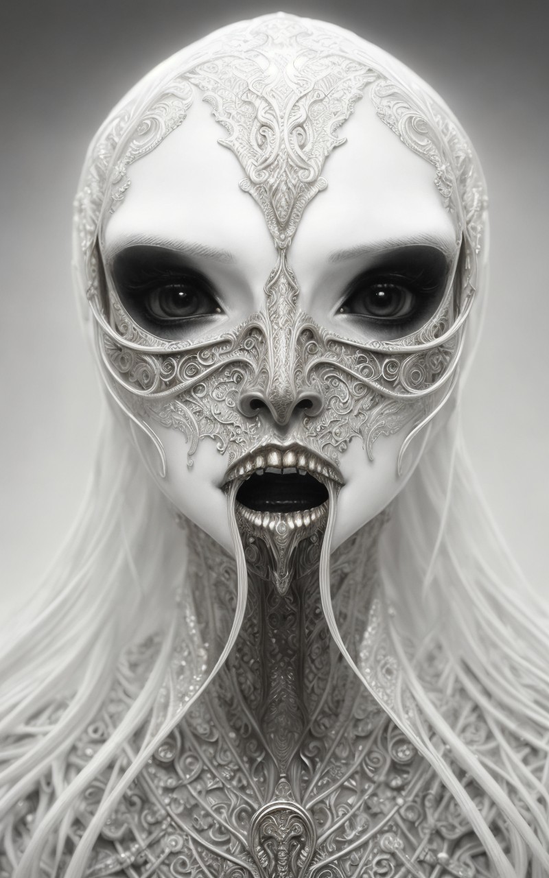 + Prompt:hyper-realistic,hyper-detailed fantasy art; elegant, intricate, detailed, highly detailed face, accurate anatomy and eyes, by Daniel f gerhartz, Gustave dore, hr giger, tom bagshaw,junji ito, biomorphic astronaut extraterrestrial, style of h.r. giger, insanely detailed and intricate, golden ratio, hypermaximalist,