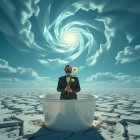 A waiting groom stands in a Tupperware container on a patterned surface, holding flowers. Above, a swirling vortex of clouds creates a surreal backdrop against a vibrant blue sky.