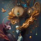 The image features two ethereal women with elaborate hairstyles, surrounded by golden, ornate designs and mystical elements. Birds and jewels add a dreamlike quality to the enchanting scene.