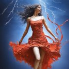 A ethereal figure in a glowing, fiery dress dances amidst swirling colors and lightning. Her hair flows with energy, embodying a powerful connection to nature and the cosmos.