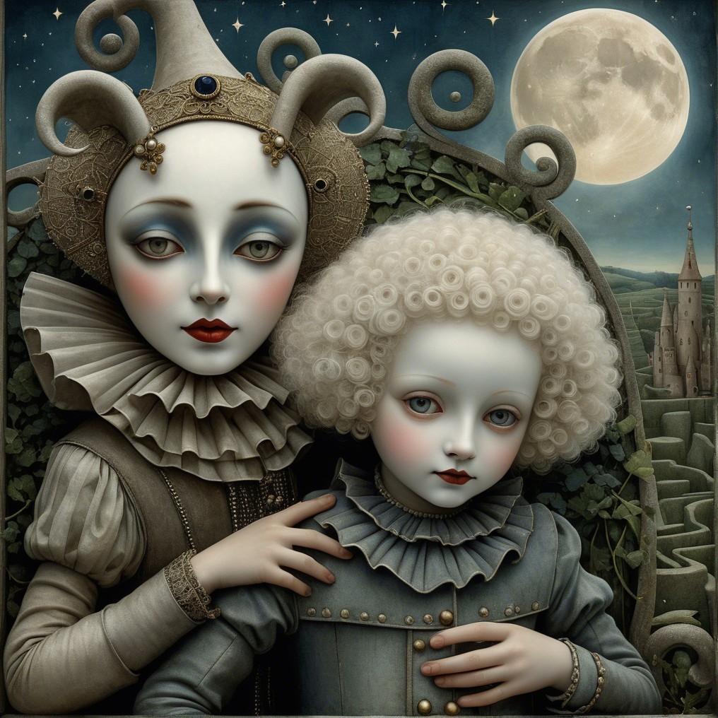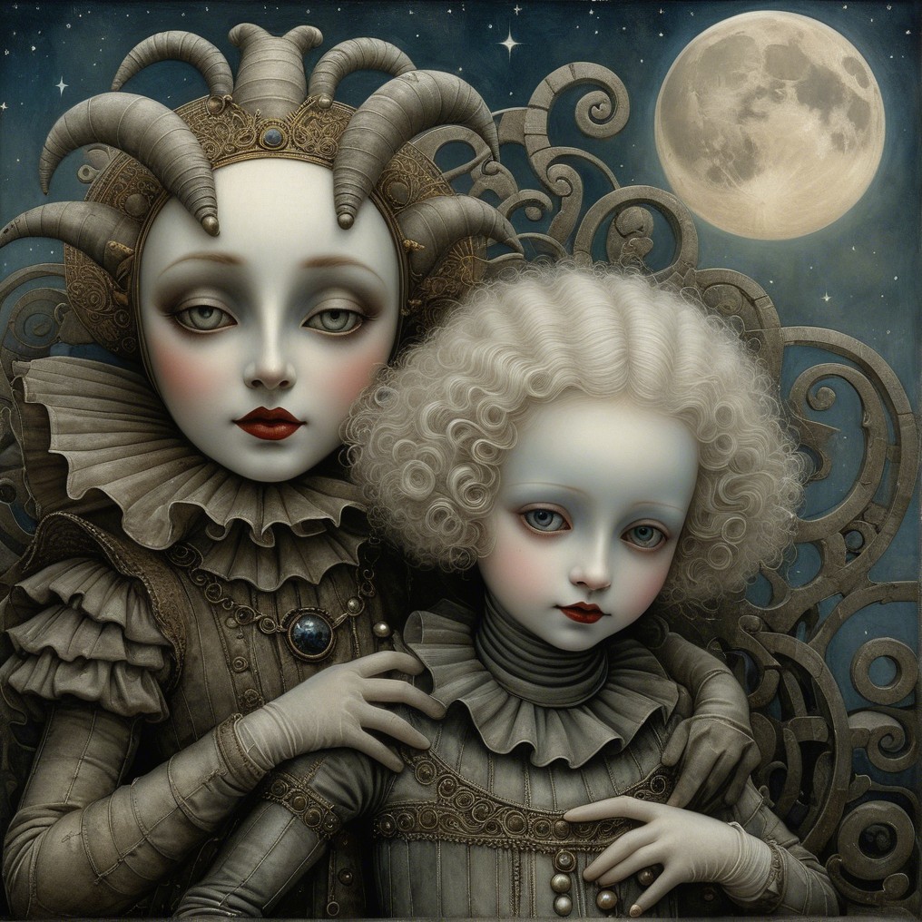 The image features two ethereal figures with porcelain-like skin, dressed in elaborate, vintage-style costumes. They stand against a starry night with a large moon, exuding a haunting, otherworldly vibe.