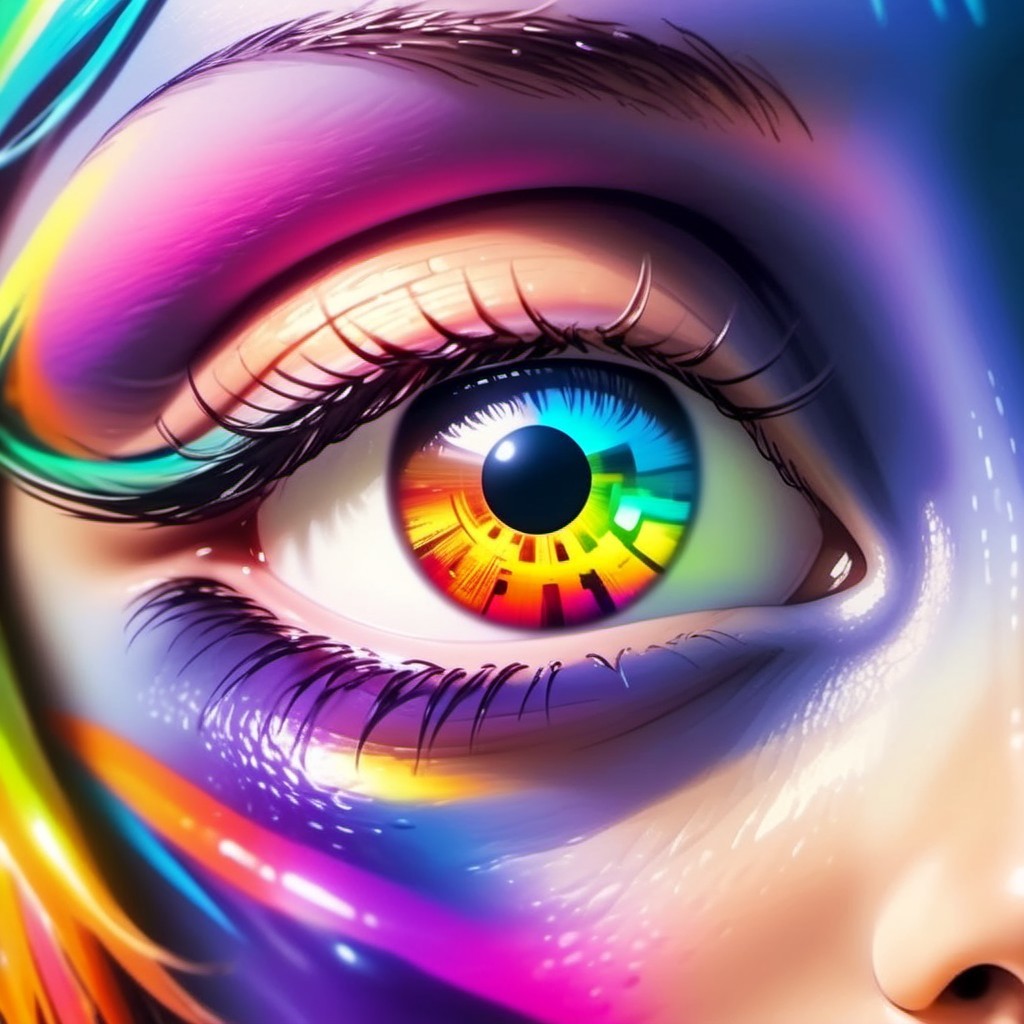 A vibrant close-up of an eye with multi-colored rainbow hues surrounding the iris, showcasing vivid and fantastical makeup artistry.