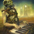 Futuristic Alien Figure at Vintage Piano in Surreal Setting