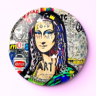 The artwork features a striking portrait of a woman with long, dark hair and bold red lips, set against a modern abstract background of gray, gold, and red elements in a circular frame.