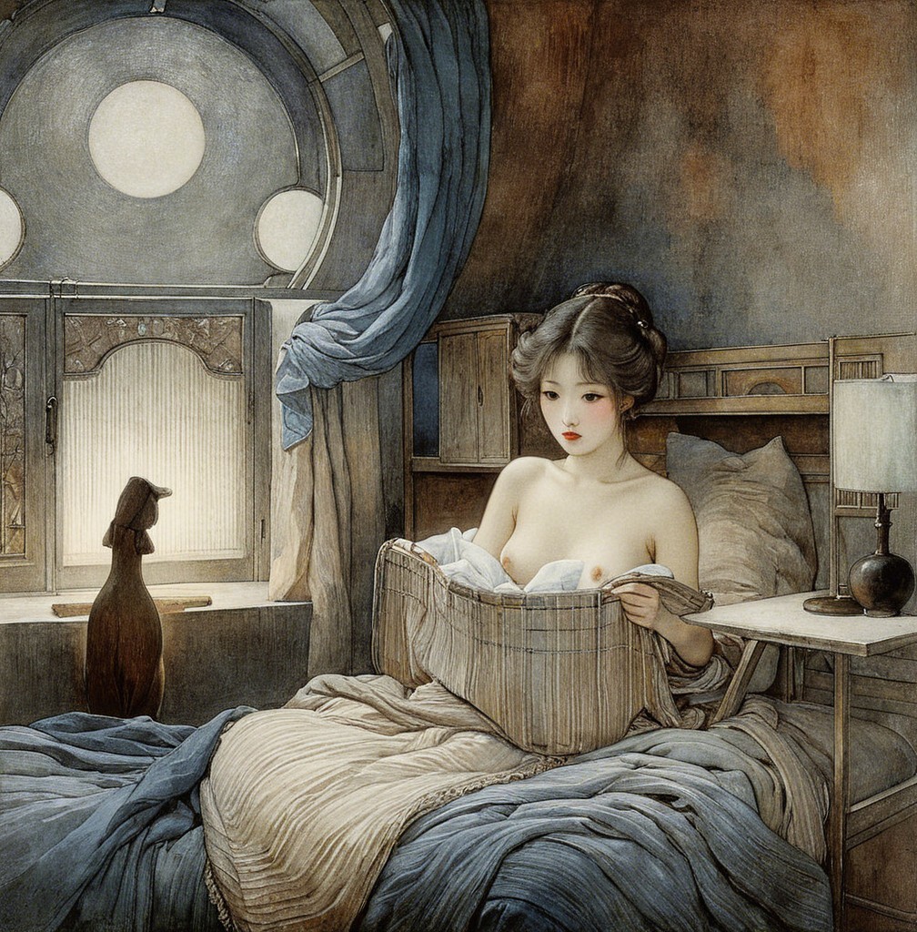 A serene young woman sits on a bed in a softly lit room, dressed in a flowing white garment. She gazes thoughtfully, holding a delicate object, while natural light filters through the window.