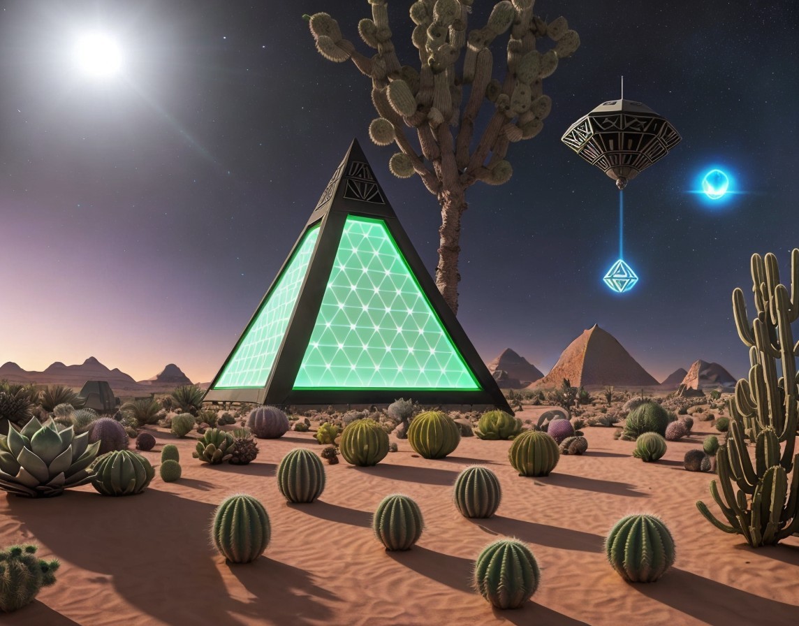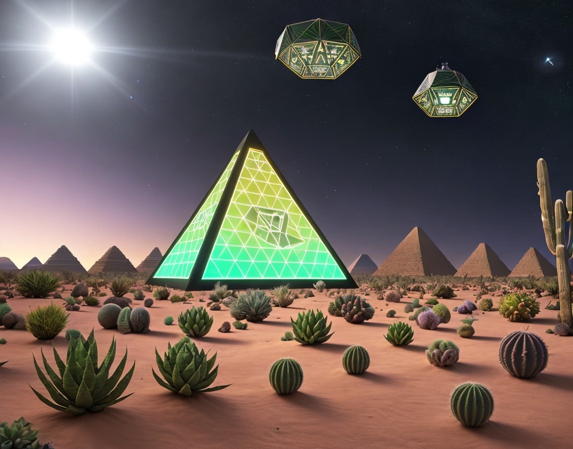 UFO/UAP, alien spacecraft, spaceship, Flying saucer hovering above a High-tech extraterrestrial pyramid assimilated with arcane sacred geometric patterns and advanced alien technology on a desert planet with cacti and succulents. Small desert