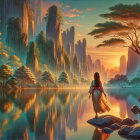 A serene scene features a woman in a floral kimono standing by a tranquil river, surrounded by mountains and towering trees. The colorful sky reflects beautifully on the water's surface.