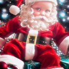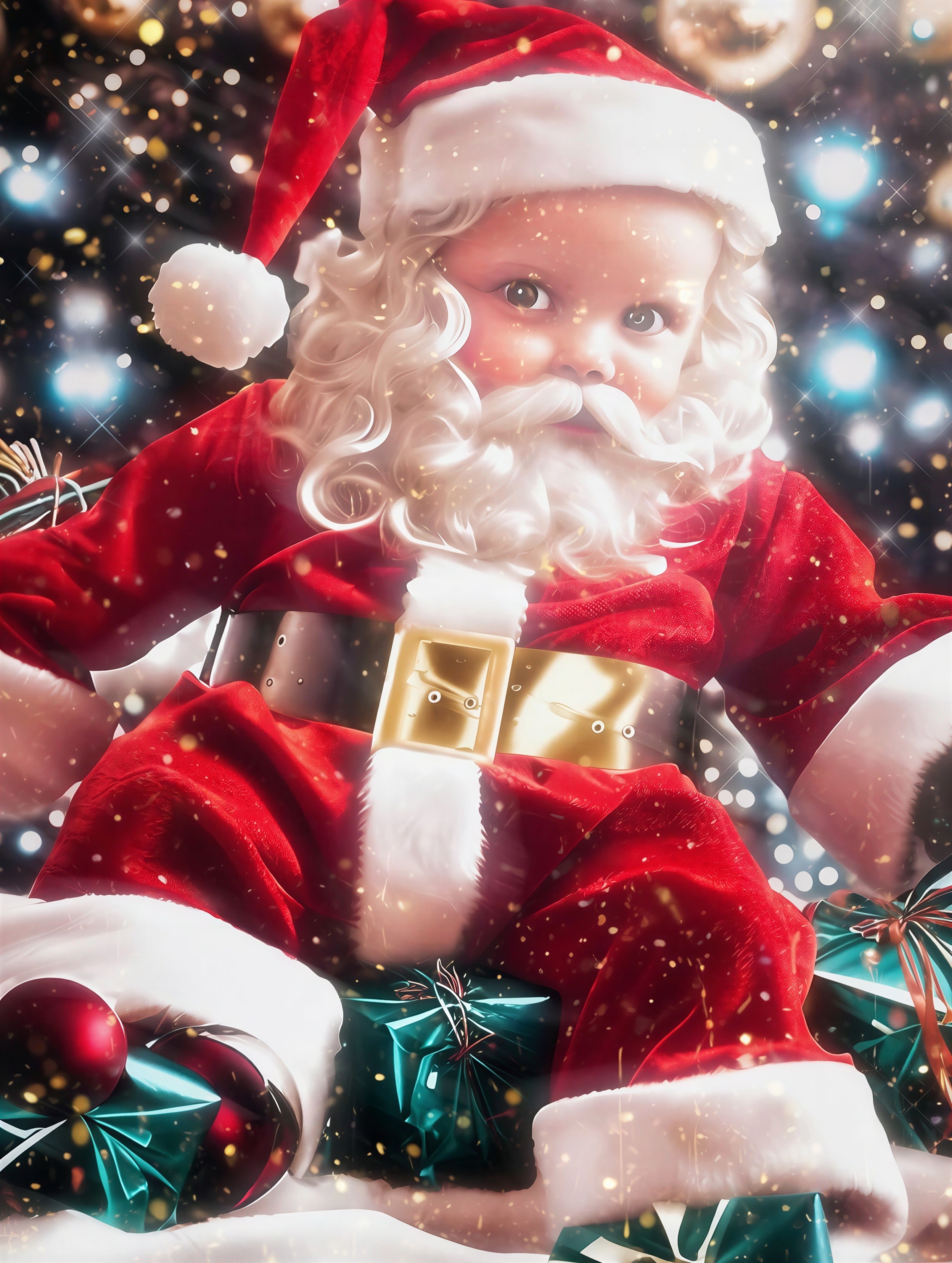 Smiling baby dressed in a full Santa Claus outfit with a red hat, white fluffy trim and pompom, white curls, and a fake white mustache and beard, wearing a red velvet suit with white furry trim and a shiny gold belt buckle, surrounded by dark teal wrapped gifts with gold ribbons and one red