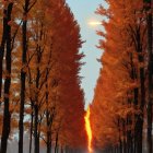 A solitary figure walks down a tranquil path flanked by tall trees adorned with vibrant orange leaves. Two birds fly overhead, adding to the serene autumn atmosphere.