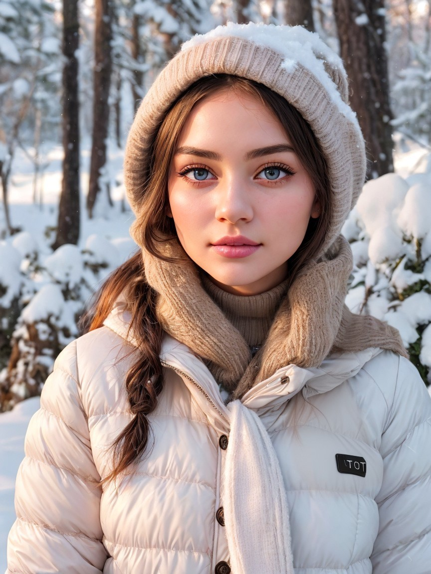 A young woman stands in a snowy forest, wearing a cozy cream-colored puffer jacket and a knitted hat. Delicate snowflakes rest on her scarf as she gazes softly into the camera.