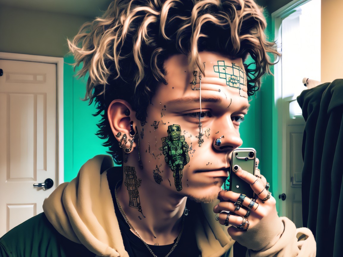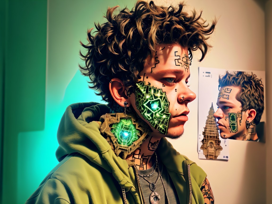 A young person with a futuristic, cybernetic design on their face and neck wears a stylish green jacket. Behind them is a wall featuring an abstract, glowing insect-like figure.