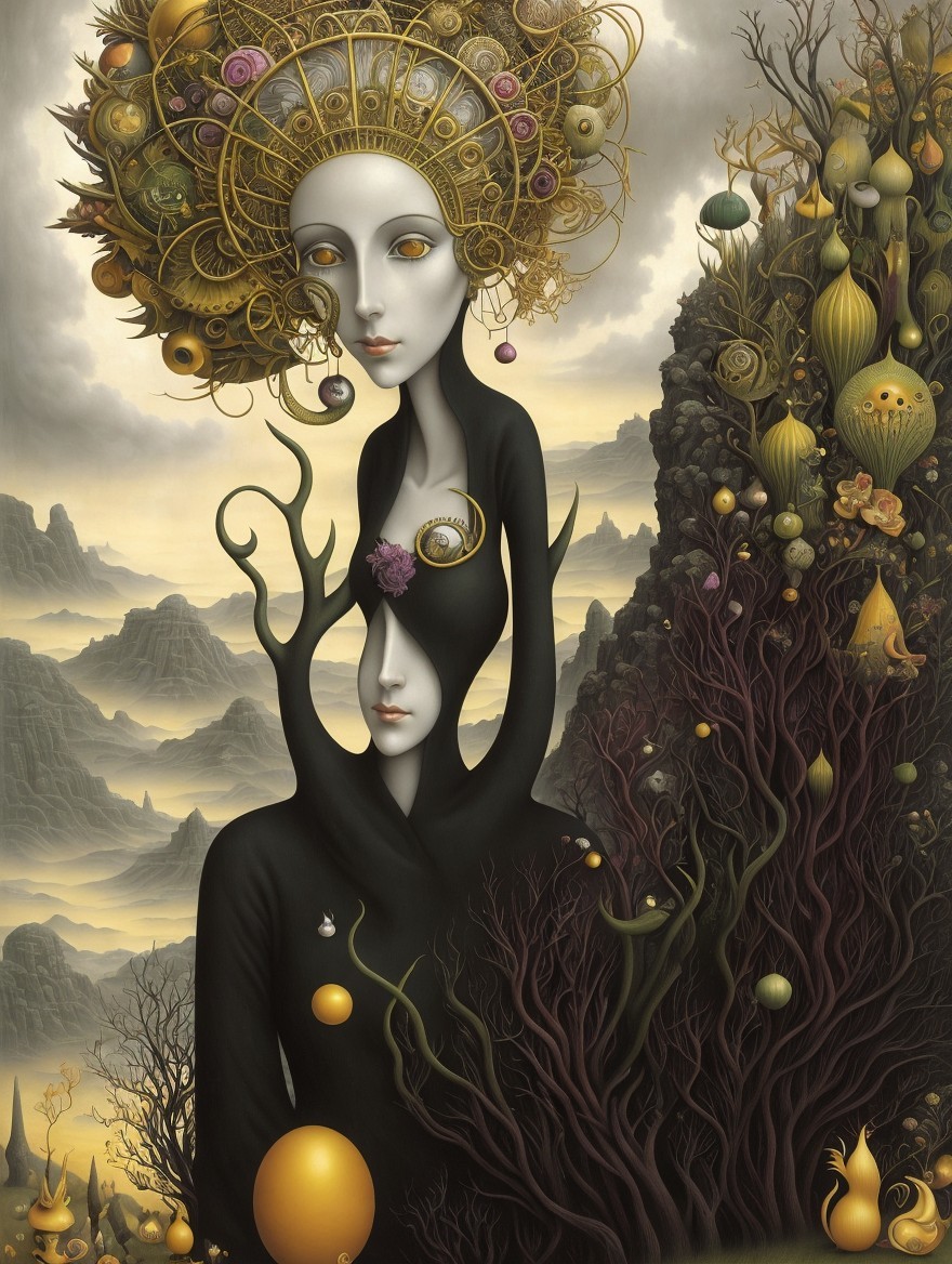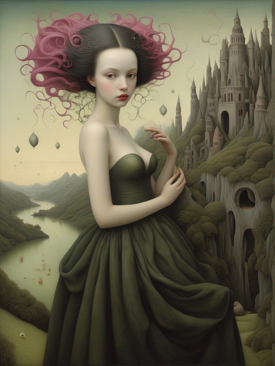 A surreal portrait of a woman in a green dress with a castled landscape and floating pink balloons in the background.