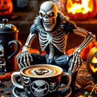 A skeletal figure with wings leans over a steaming cup, flames flickering around it. Its intricate design features detailed bone structure and a mischievous grin, set against a whimsical outdoor background.