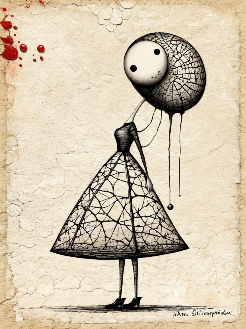 Prompt: "(( as my emotions keep me afloat in droste effect of minimalistic whimsical biomechanoid oddity by some whimsical illustration, magical, by Anna Silivonchik & Sam Toft & Stewart Edmondson, made with blood ink using just a few curved cuts in impasto thick cracked cracking and damage in multilayers ))"