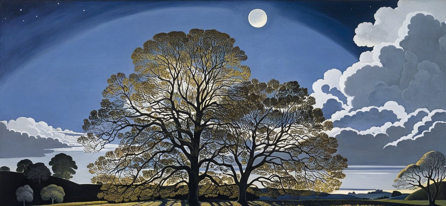A majestic tree stands silhouetted against a bright blue sky, adorned with vibrant autumn leaves. Fluffy clouds drift by, enhancing the serene beauty of the landscape.