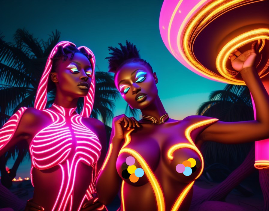 Three animated women with glowing neon body paint and accessories, set against a night background with neon rings.
