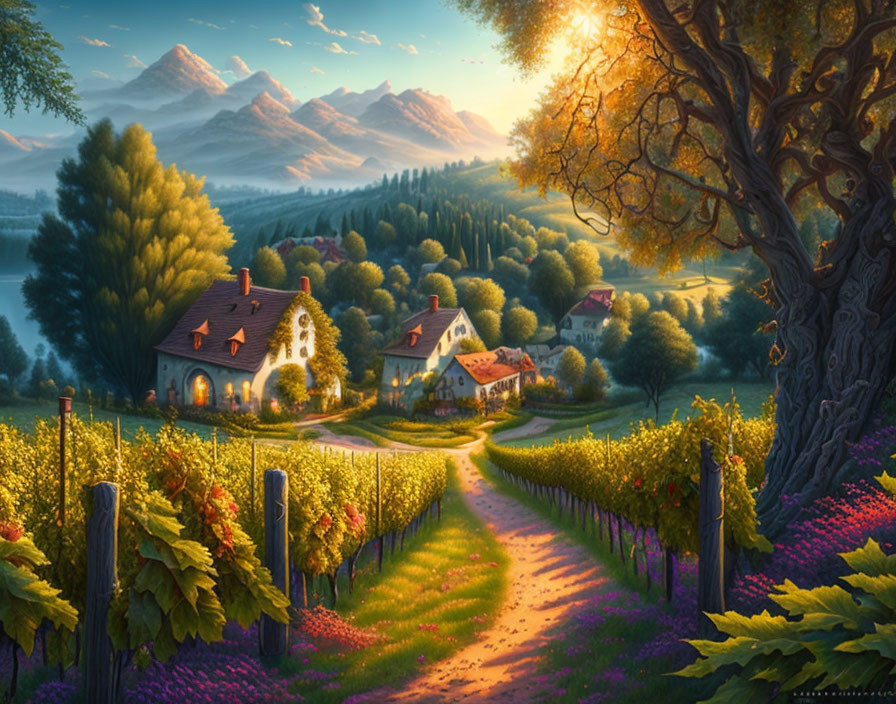 Prompt: vineyard landscape, beautiful, Hovik Zohrabian, Earnst Haeckel, Jacek Yerka, Thomas Kinkade, digital painting, award winning, a masterpiece, crisp quality, HQ, ultra detailed, 8k, intricate, fantastic view, acrylic art