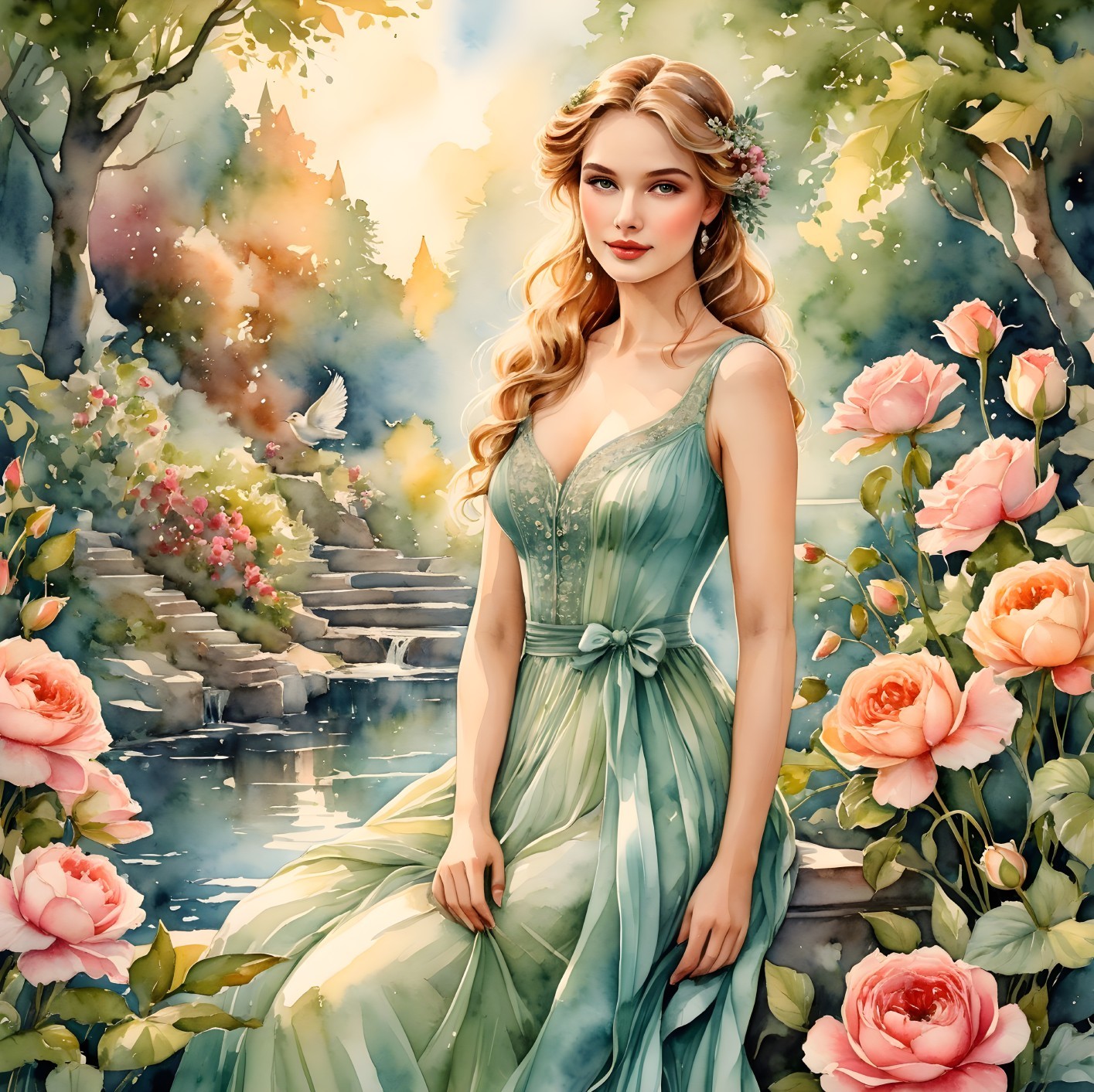 A serene young woman in a flowing green gown poses by a tranquil pond, surrounded by blooming roses and lush greenery, with a soft, magical light illuminating the scene.