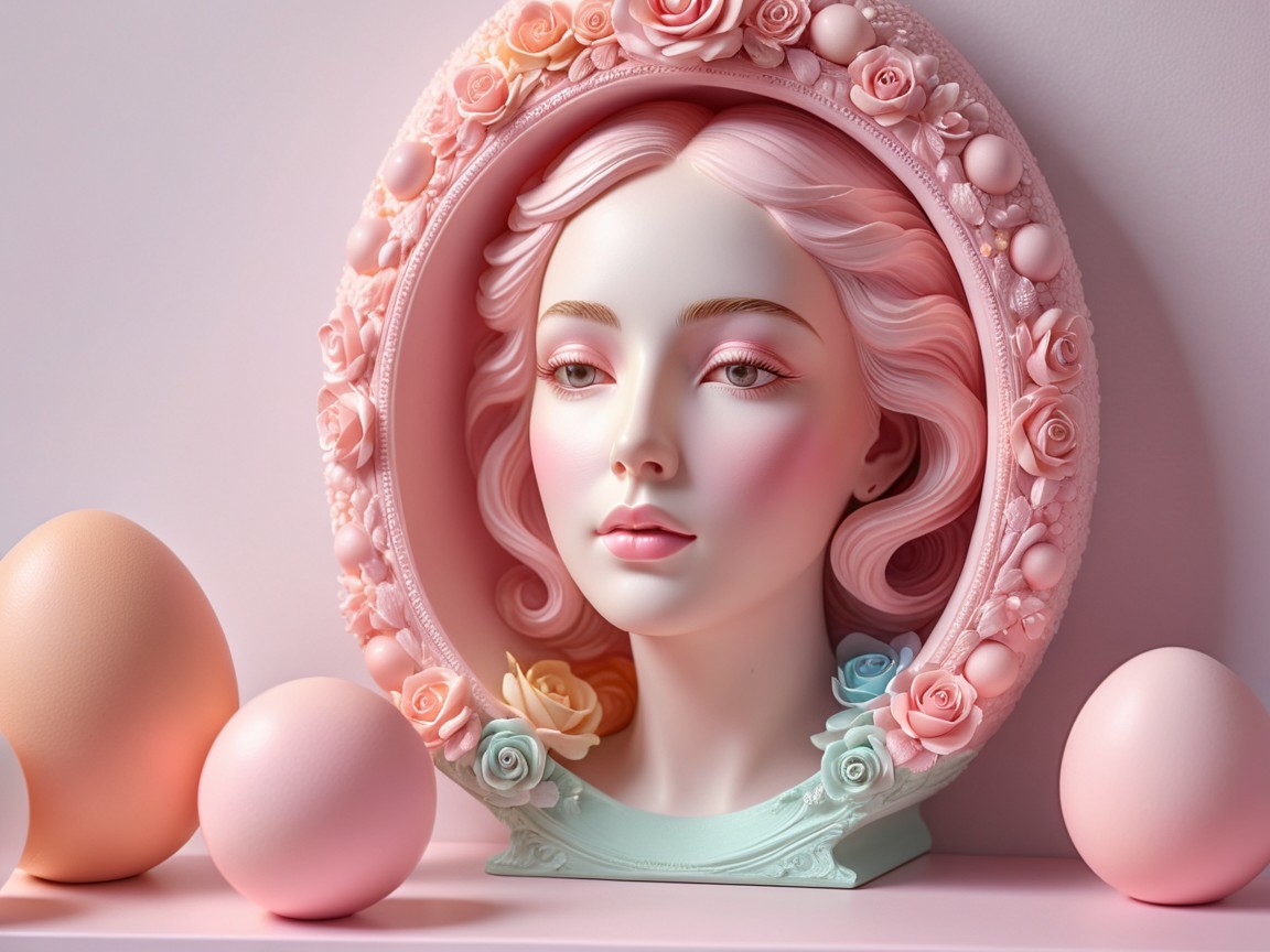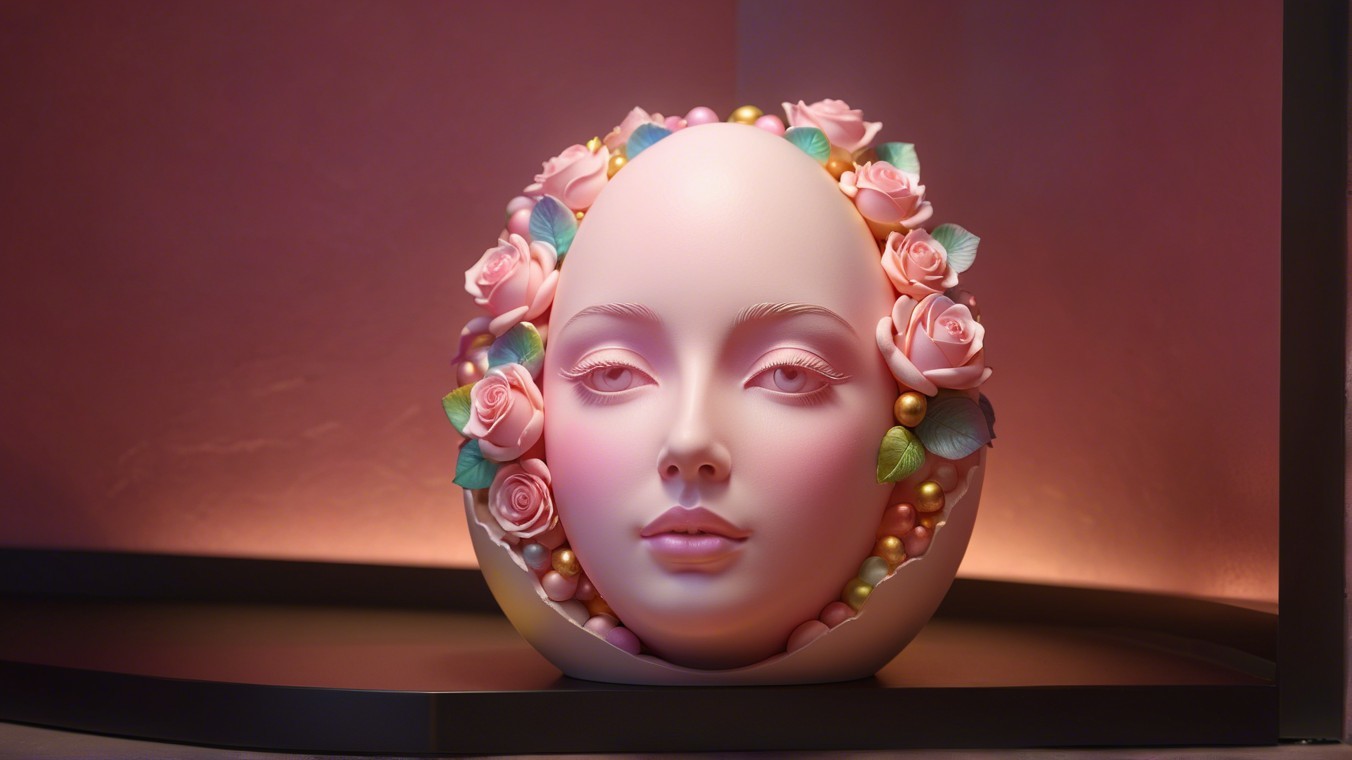 A beautifully crafted decorative egg with a serene face is surrounded by soft pastel flowers and elegant foliage, set against a backdrop of colorful balloon garlands.