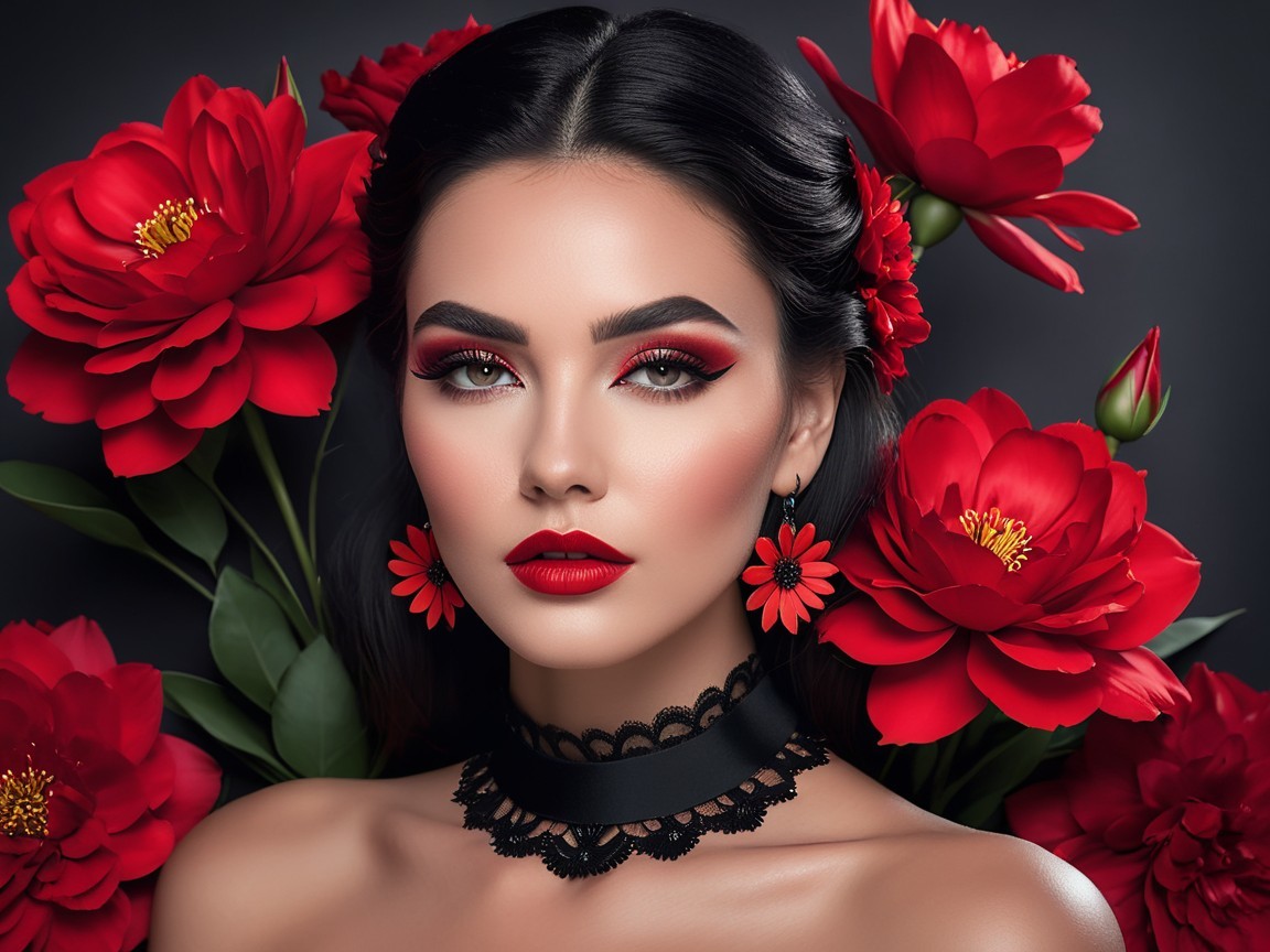 Prompt: "portrait of woman with serene expression,large,vibrant red flowers in dark hair,bold artistic makeup,dramatic winged eyeliner,soft blush,complementing fair skin,elegant black choker,laced details;softly blurred background,emphasizing captivating gaze,rich flower colors;high resolution,8k,ultra-realistic,cinematic lighting,stunning visuals"