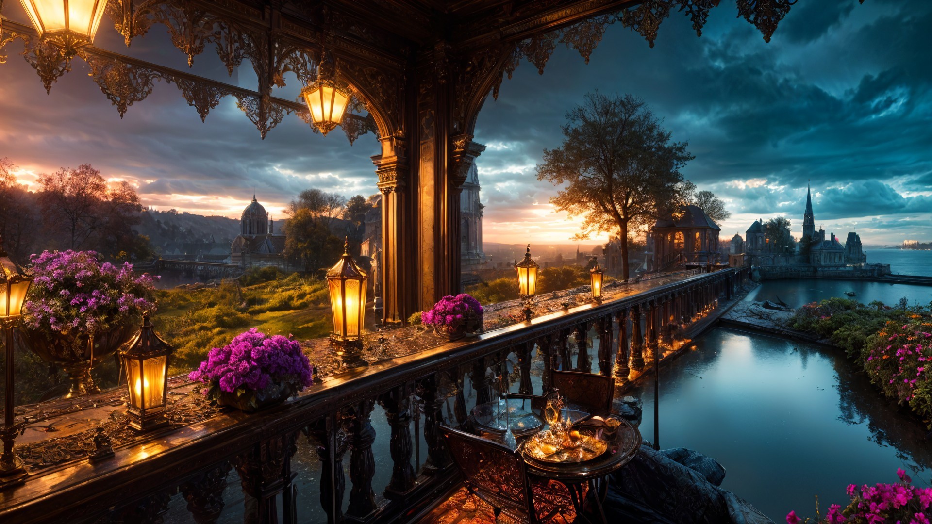 A beautifully ornate balcony overlooks a serene river at sunset, adorned with vibrant flowers and glowing lamps. The dramatic sky adds an enchanting touch to the picturesque landscape.