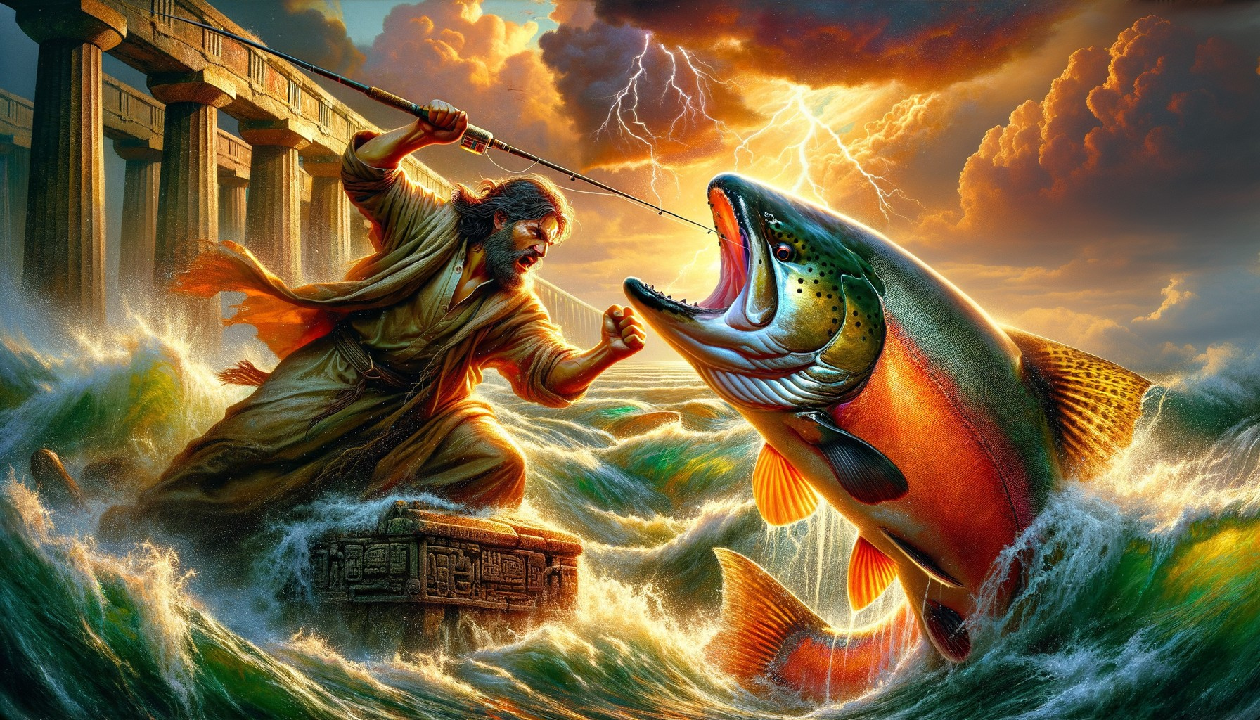 A man in a robe battles a giant fish in stormy seas under a bridge, with dynamic lighting and dramatic clouds in the background.
