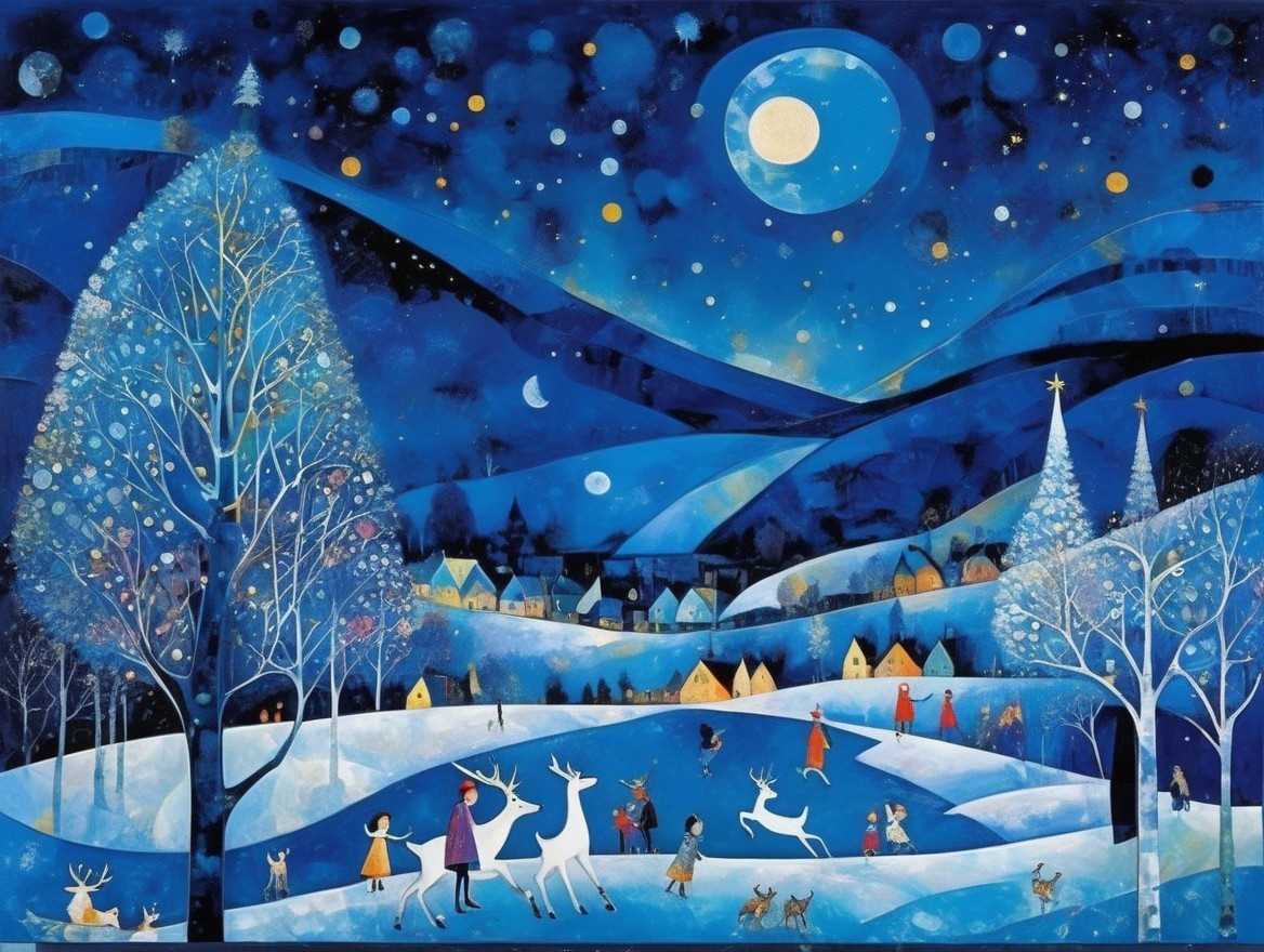 Nighttime Landscape with Full Moon and Snowy Village Scenery