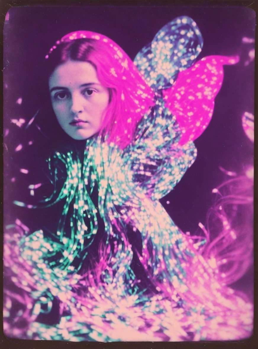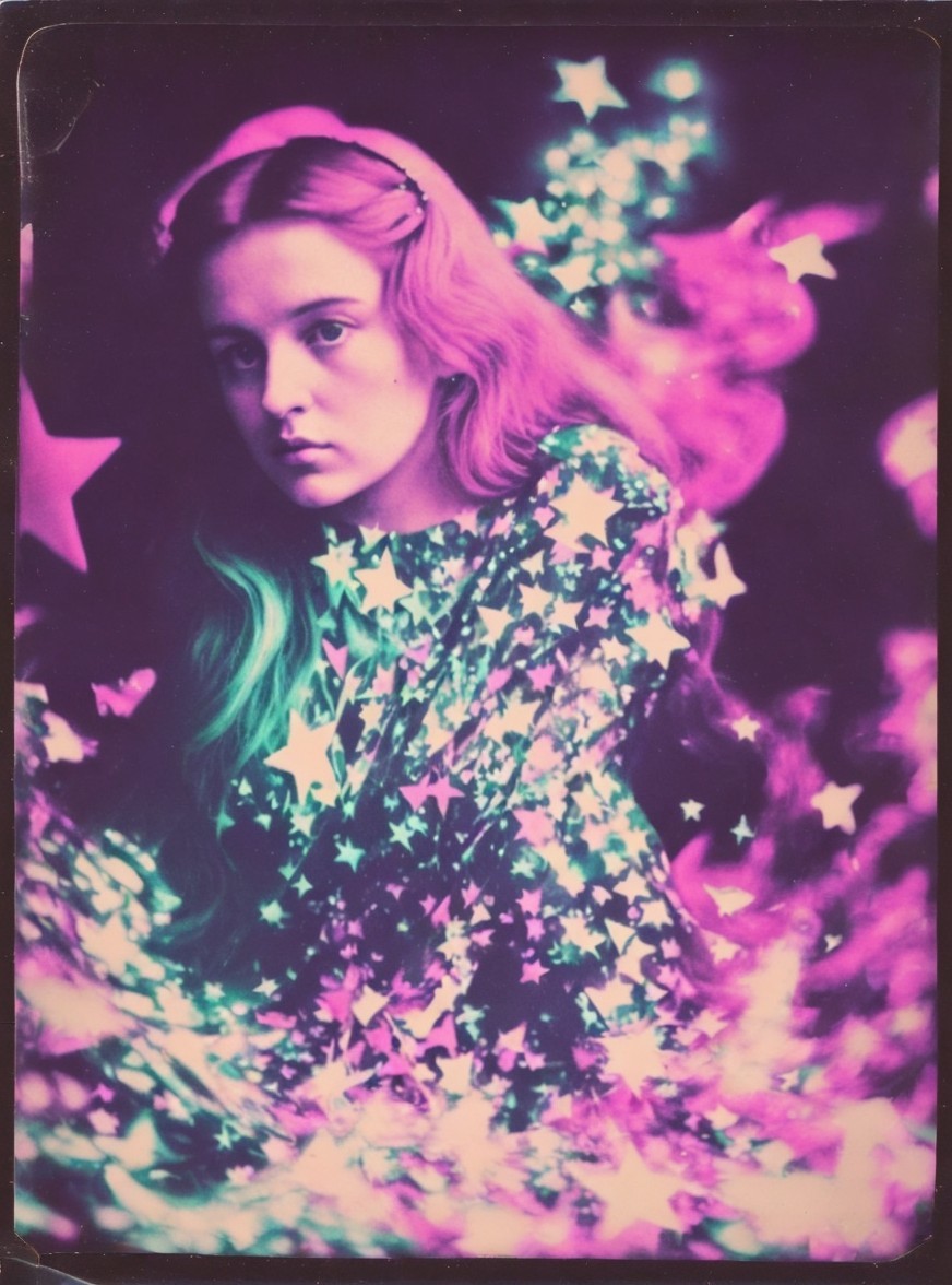 A young woman with wavy hair gazes thoughtfully, surrounded by vibrant, swirling stars in shades of pink and purple, creating a dreamy, ethereal atmosphere.