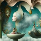A surreal landscape featuring ethereal figures with elongated faces, ornate pillars, and whimsical elements. Soft colors blend with dreamlike forms, creating a captivating and imaginative scene.