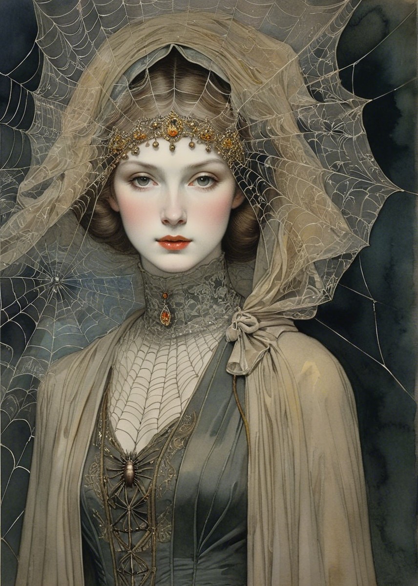 A young woman adorned with autumn leaves and delicate webs stands before a dark doorway. Her serene expression contrasts with the intricate spiderwebs and a small spider resting on her chest.