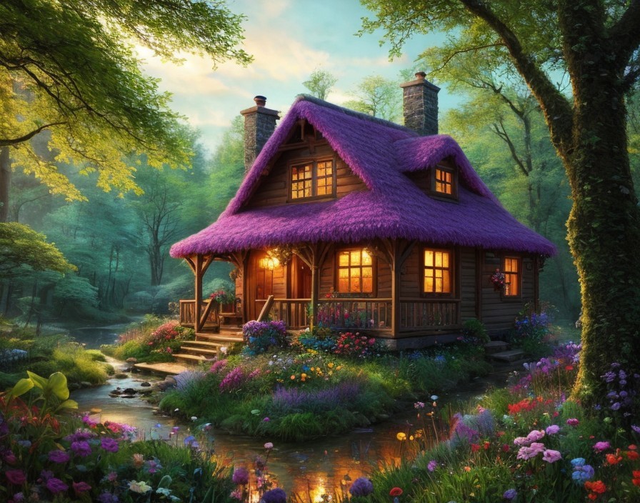 Enchanting cottage with a purple roof, surrounded by lush gardens, at twilight with warm lights glowing from windows.