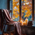 A cozy scene featuring a wooden chair draped with an orange blanket. Nearby, lit candles illuminate the space, while vibrant autumn leaves scatter on the floor and outside the window.