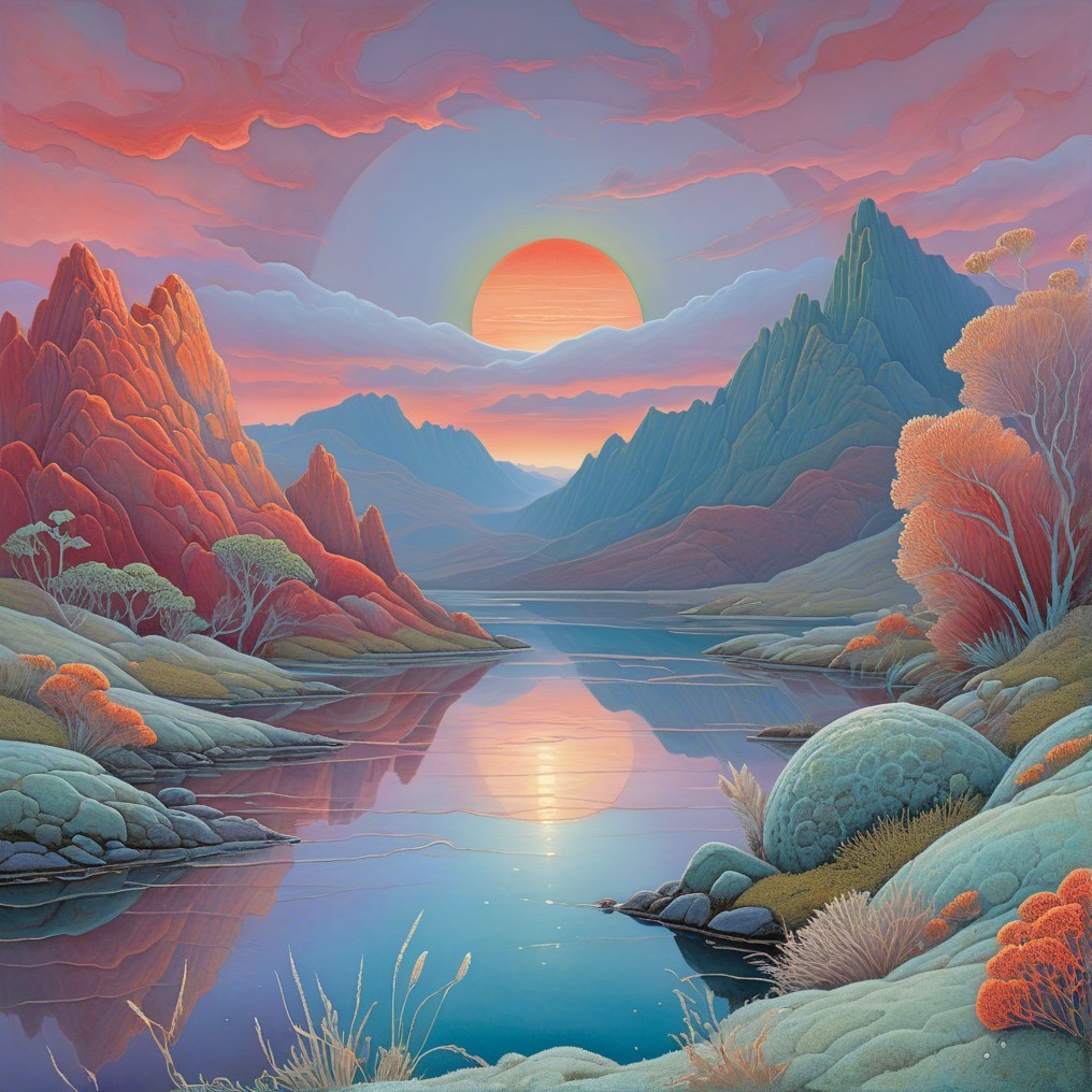 A vibrant, surreal landscape featuring towering red and green mountains, a reflective river, and a glowing sunset, all enhanced by colorful vegetation and dramatic skies.