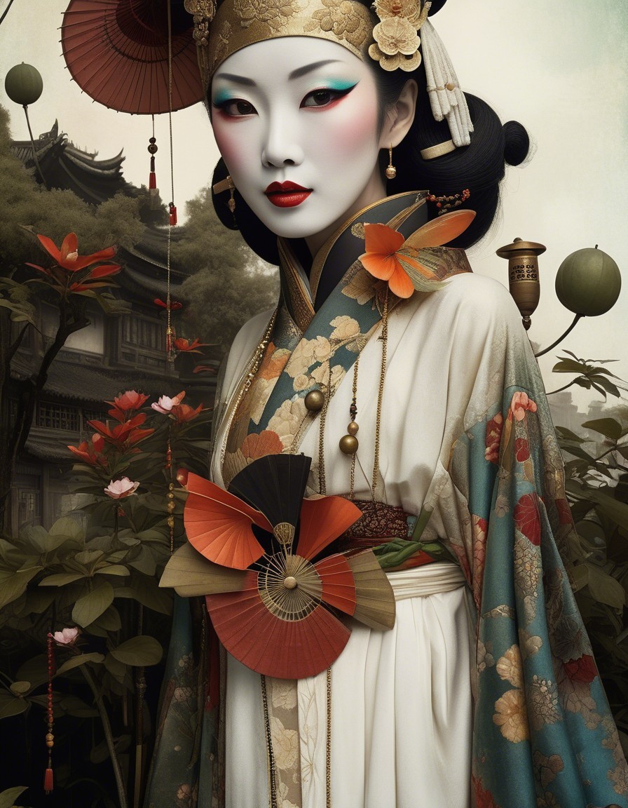 Close up, impish amused beautiful vintage Shanghai geisha in a old Shanghai garden dreamscape in the style of Alexander Jansson. by Catrin Welz-Stein, Michael Parkes