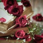 A beautiful arrangement of vibrant red roses surrounds a stack of vintage books. Delicate white flowers and scattered rose petals add an elegant touch to this artistic composition.