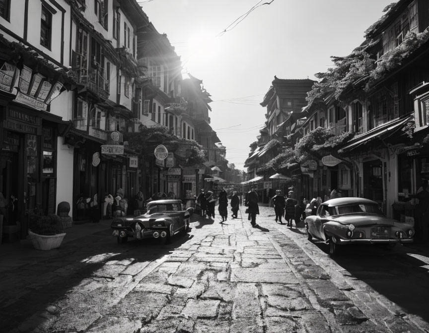 Traditional Street with Old Houses and Shops in Sunlight