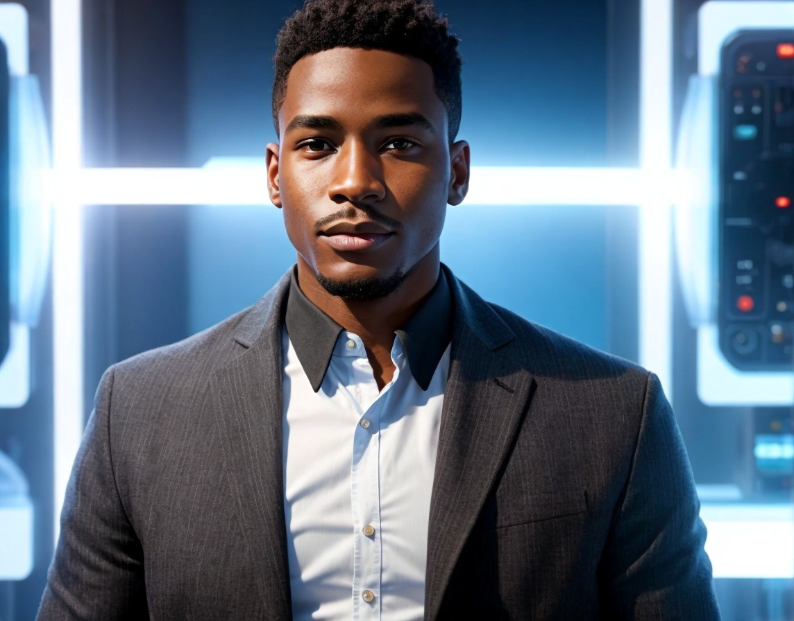 Young man in gray blazer with beard and mustache against futuristic control panel