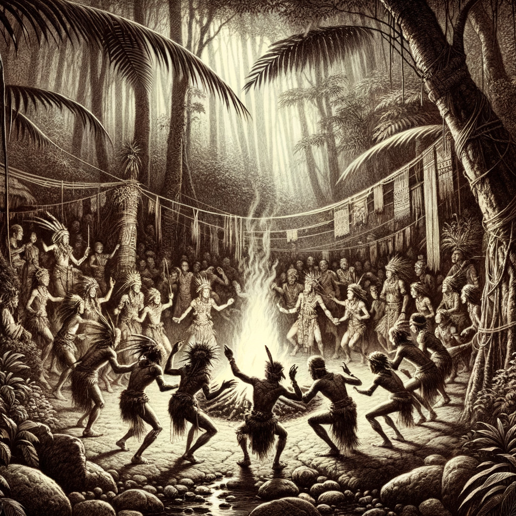 A vibrant scene depicting a tribal gathering in a lush jungle. People dance around a large fire, surrounded by dense foliage, showcasing unity and cultural celebration under a glowing sunset.