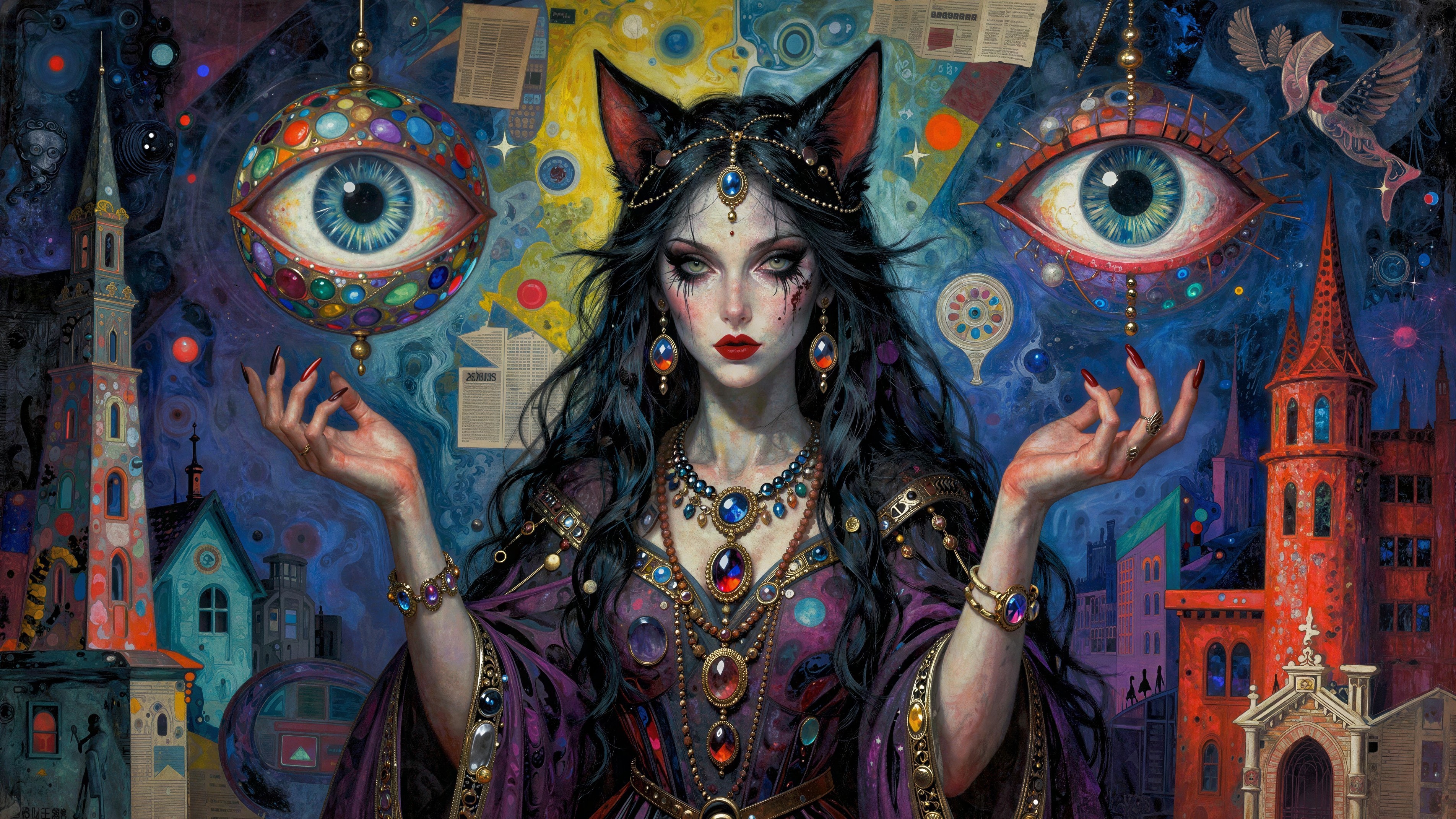 An intricate, detailed, and colorful artwork featuring a dark-haired woman with cat ears and adorned with jewels, against a background of fantastical cityscapes and floating eyeballs. The woman, with pale skin, red lips, and dramatic eye makeup, wears a regal purple and gold gown with numerous intricate necklaces featuring