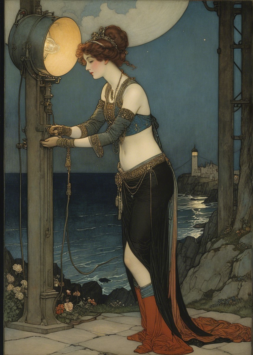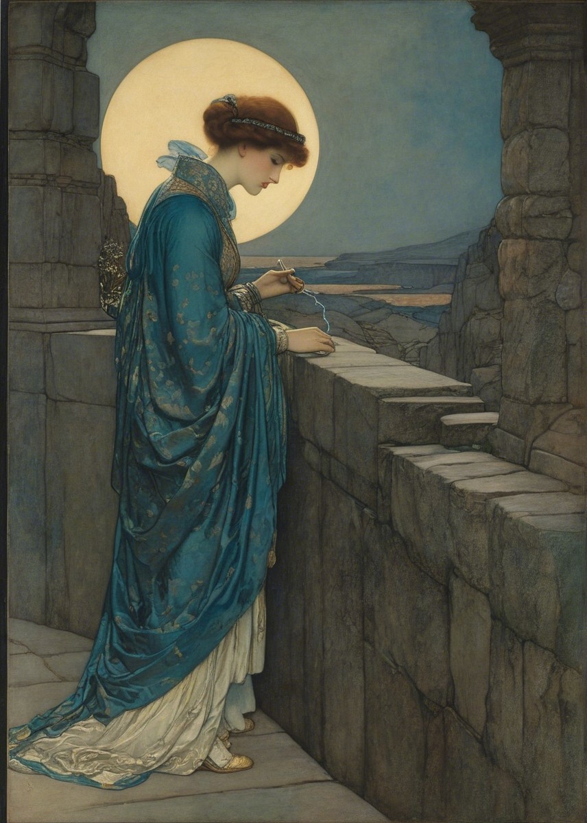A graceful woman in a flowing blue gown stands in an archway, holding a delicate object. A cloaked figure kneels nearby, adding a sense of mystery to the serene, illuminated scene.
