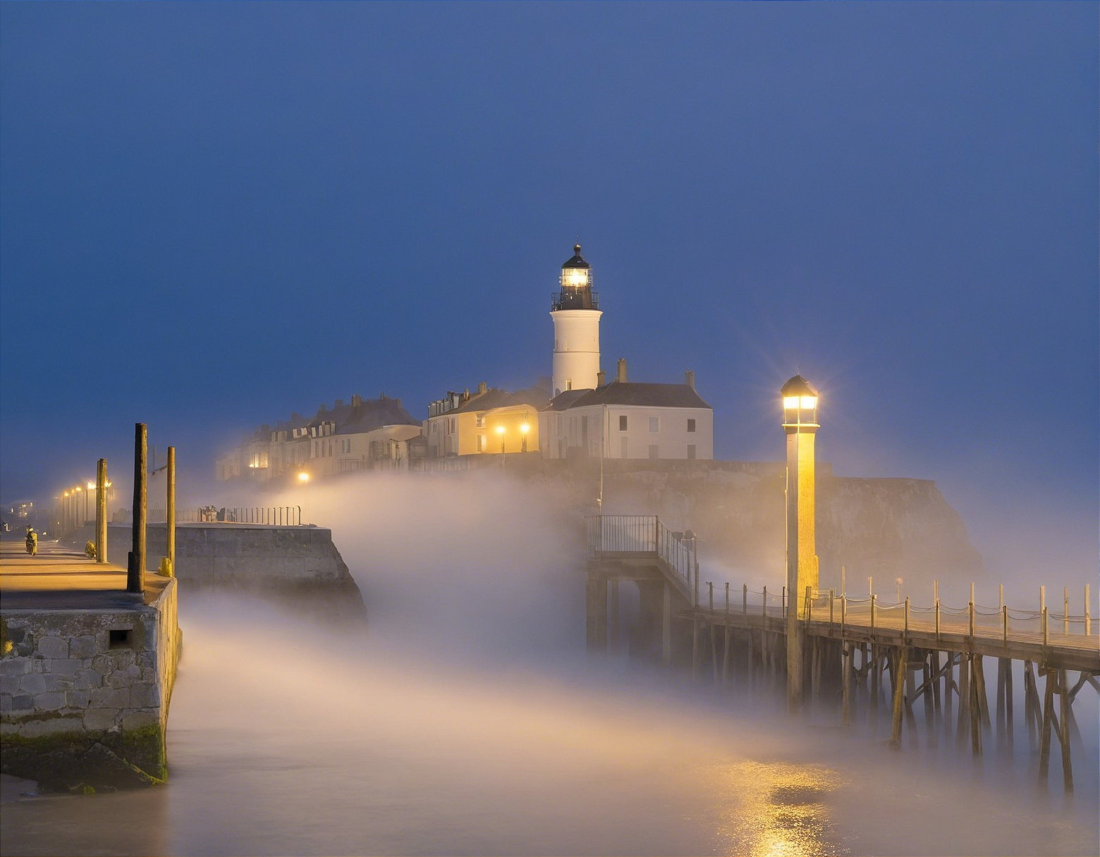 Twilight Lighthouse Scene by Calm Waters and Mist