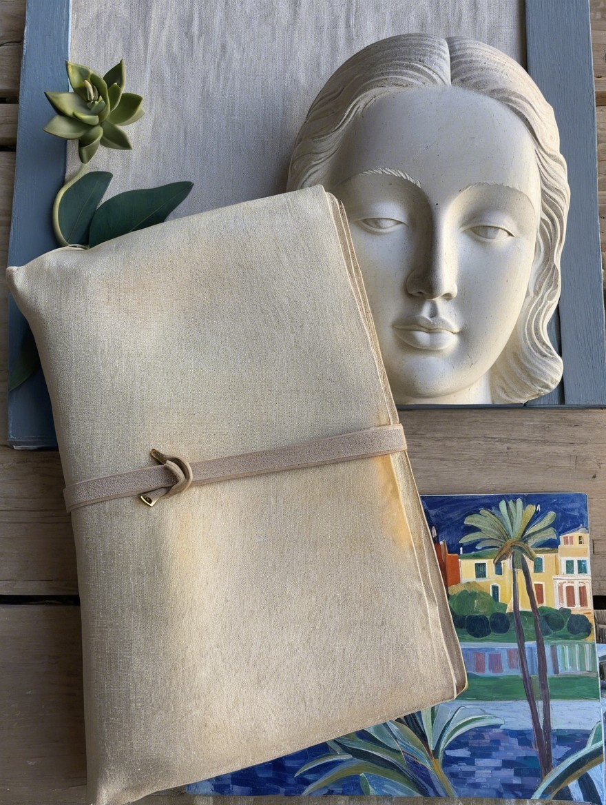 An open sketchbook rests on a wooden surface, surrounded by vibrant paintings featuring arches and floral arrangements, showcasing a blend of architecture and nature in soft colors.