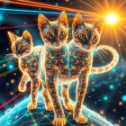 Prompt: "Futuristic quantum cats existing in multiple states at once, partially transparent with glitching holographic outlines. They stride across a digital cosmos of energy grids, particle trails, and wormholes. The background shows collapsing stars and quantum fields in vivid neon blues, greens, and gold."