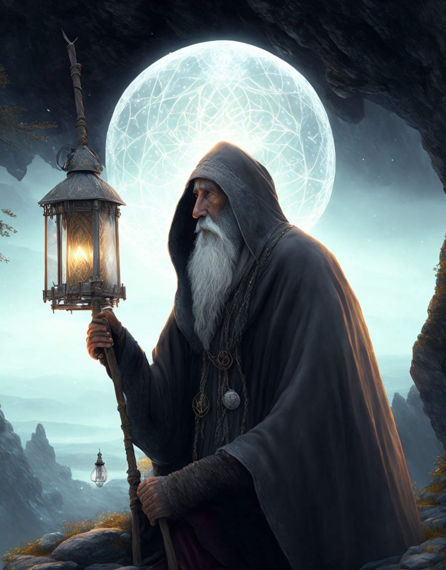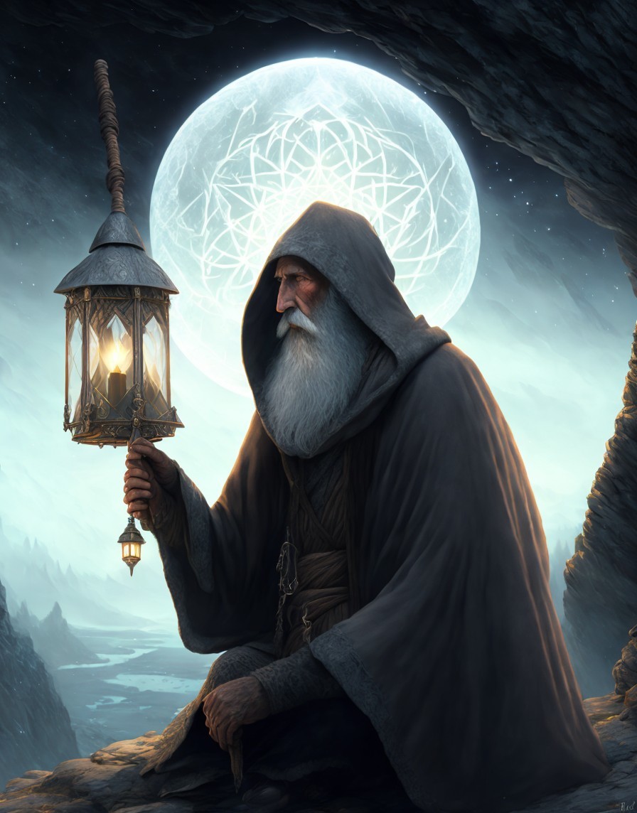 An old wizard with a lantern sits contemplatively under a luminous full moon on a cliffside at night.