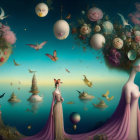 A whimsical scene featuring ethereal figures with elaborate floral headdresses, surrounded by colorful orbs and flying creatures, set against a serene, turquoise landscape.
