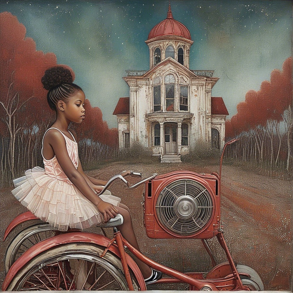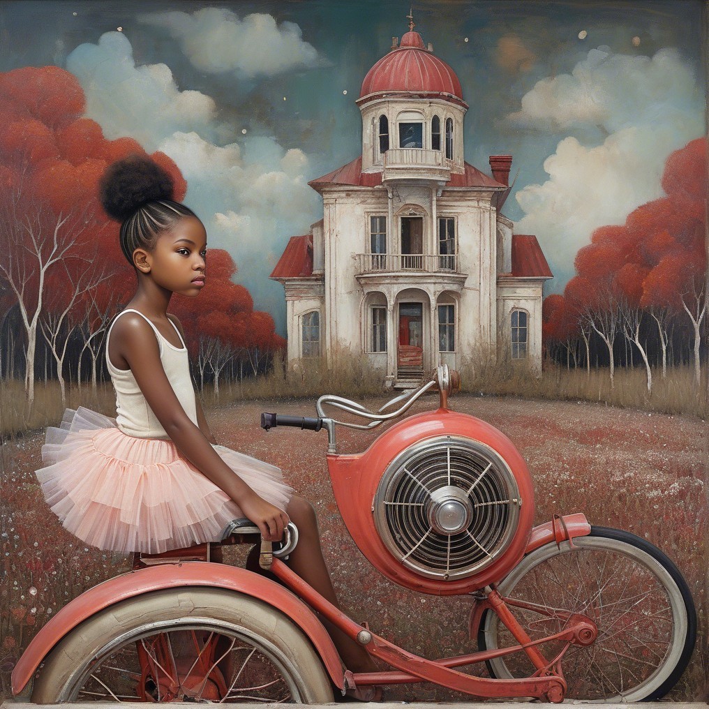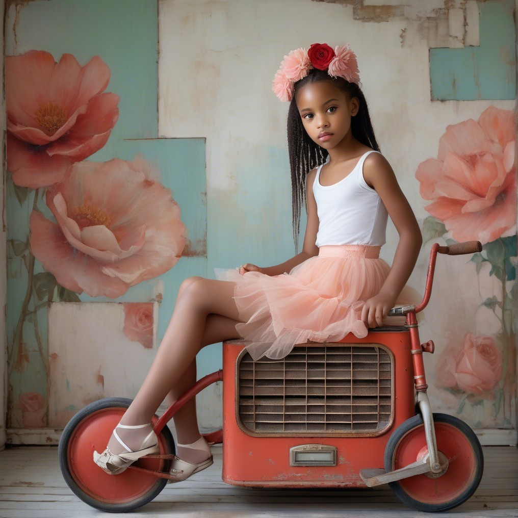+ Prompt:influenced by Klimt, Flora Bowley, Lovely young African American girl's face, 9 years old, A highly detailed, realistic surreal image of a young girl, sitting on an old rusted 1950's red radio flyer tricycle in an empty abandoned white room with flaking pale walls. She wears a faded pale coral tutu, undershirt, tights, and pale ballet slippers. The Eiffel Tower is faintly visible through a distant window, creating a striking juxtaposition. The artwork utilizes pointillism techniques in pale grey turquoise, moss green, red, orange, black, white, sienna, and burnt umber, reminiscent of Georges Seurat.