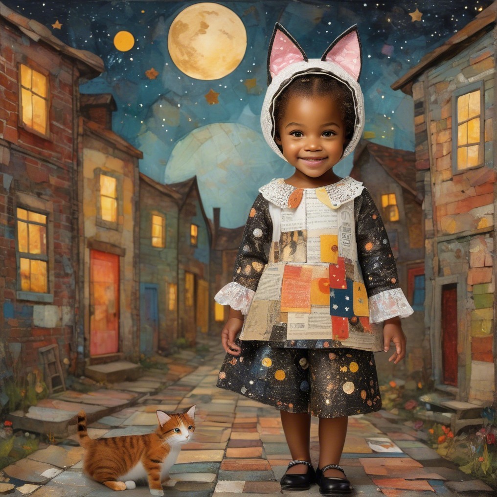 Prompt: Little African American girl in a cat costume, no anime, no cartoons, standing up, 3-D construction, Influenced by Bosch, Bruegel and Joseph Cornel, Child storybook Ink and bleach flecks mixed with oil messy brushstrokes hand drawing of a whimsical nighttime scene with a textured newspaper patchwork collage-style African American little girl, with a clear happy face, in cat costume accompanied by a cute fluffy with exaggerated features black cat with big yellow eyes lying on its back The Mysterious Children’s book -Dancing to the Harvest Moon Ball, , -Little CAfrican American girl with cat ears, tail and coat with her lovely black kitten. are setting off to dance at the Harvest Moon Ball, P.S. 067 Charles A. Dorsey School, We're here and I hope you can join us. Beautiful and thought provoking. and a bright coral small bird flying alongside them. they are under a night sky with a pale yellow crescent moon, surrounded by a field of small abstract textured black wildflowers against a textured gradient blue with orange undertones background.