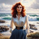 Prompt: extremely well-endowed, oil painting style of Tamara de Lempicka, hands behind head, standing on a rocky outcrop, overlooking the ocean, with foamy waves crashing in the background, mature Zasu Pitts/Mary Steenburgen/Patricia Clarkson face age 56, long fiery red curly hair is blowing in the wind, expensive feminine white button-down silk blouse, blue skirt, big shiny black belt, enormous lovely blue eyes, The lighting is soft and diffused, creating a peaceful and romantic atmosphere. The perspective is at eye level